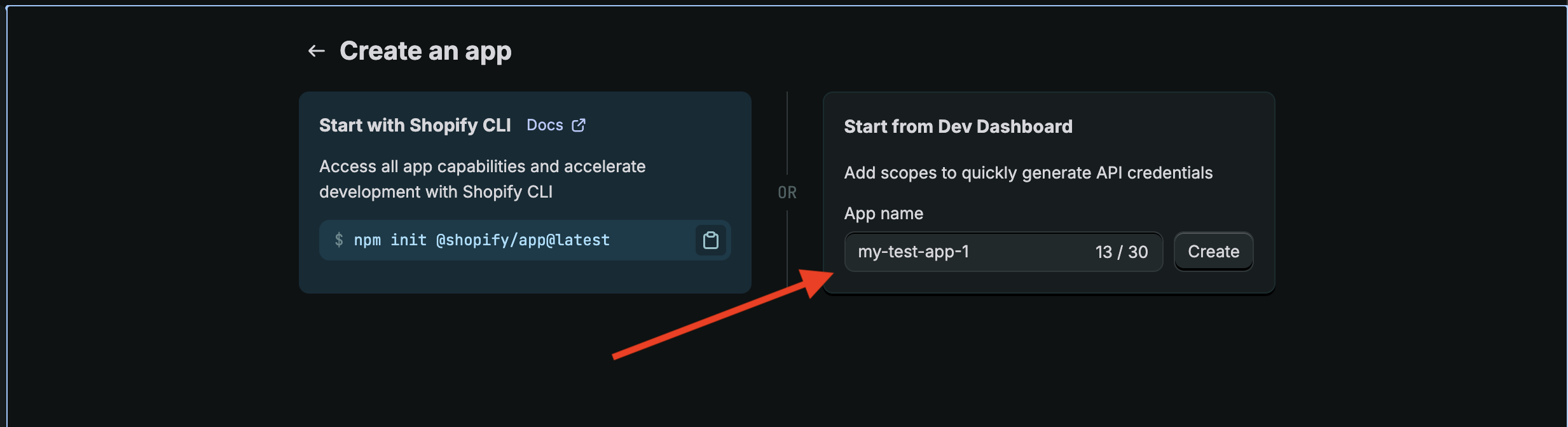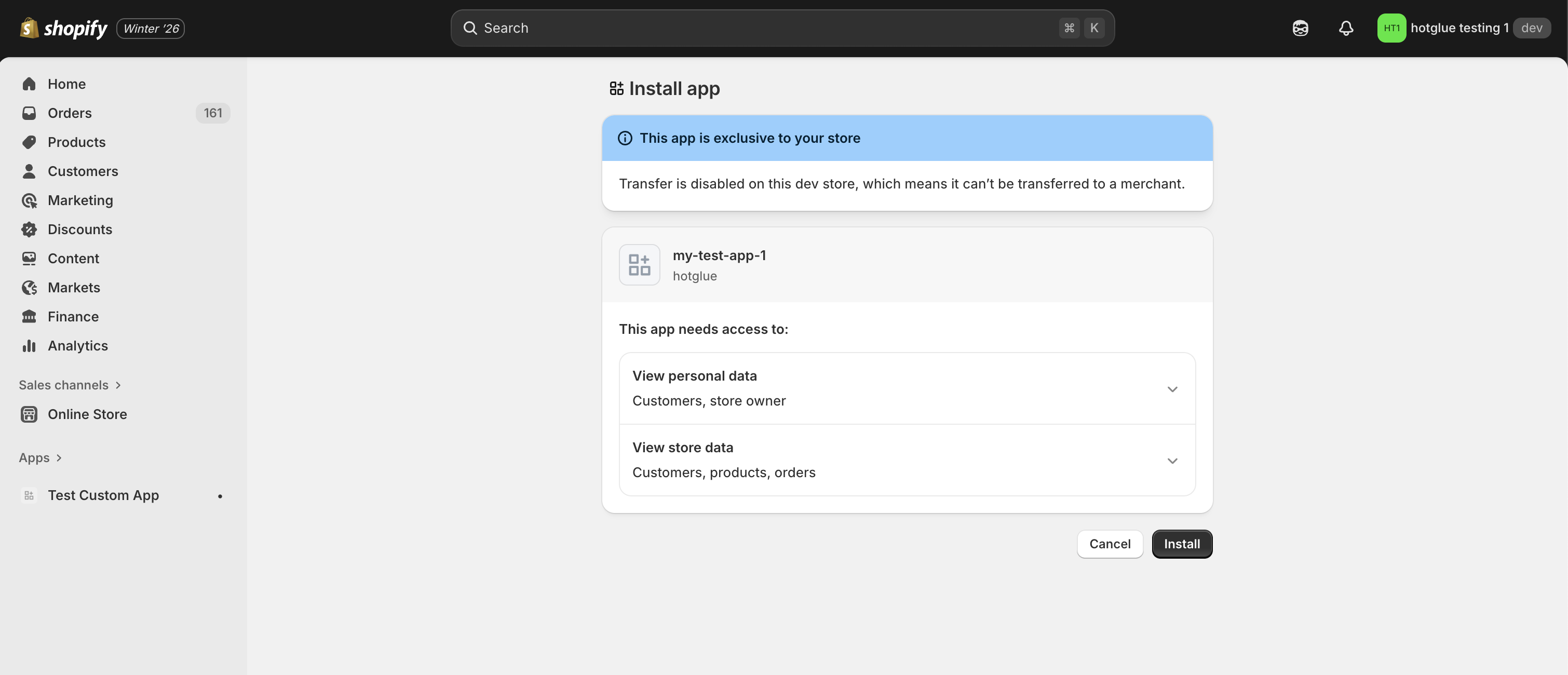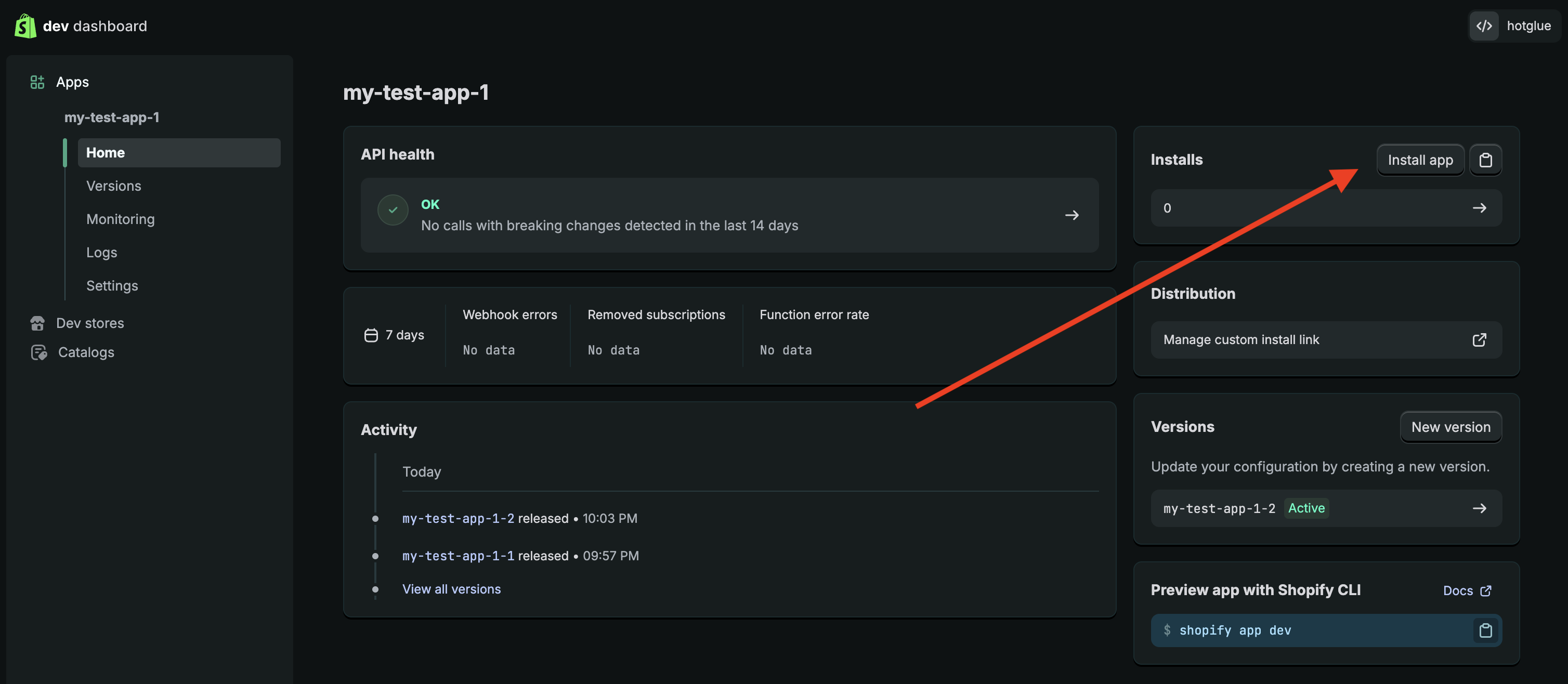 There are two ways to install this app. You can use the link we generated earlier, or directly in the Shopify Dev Dashboard you can click Home -> Install -> Select the store.