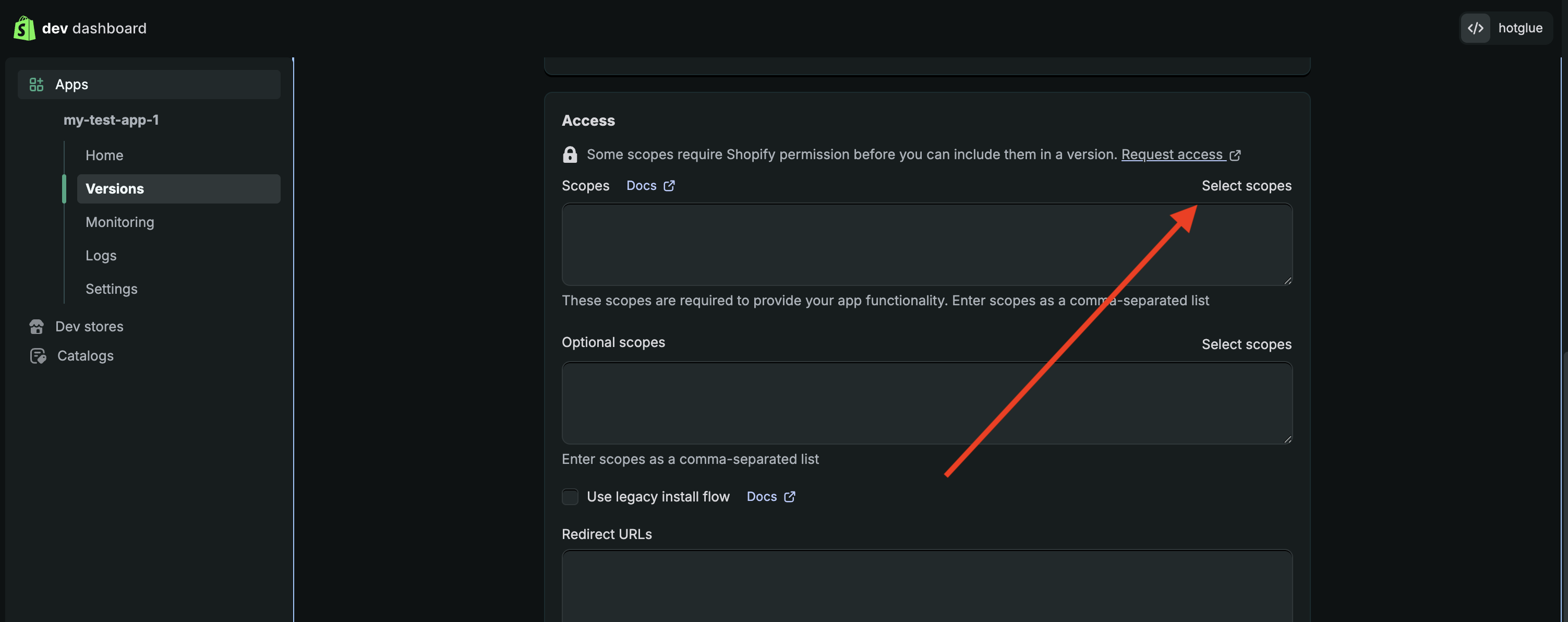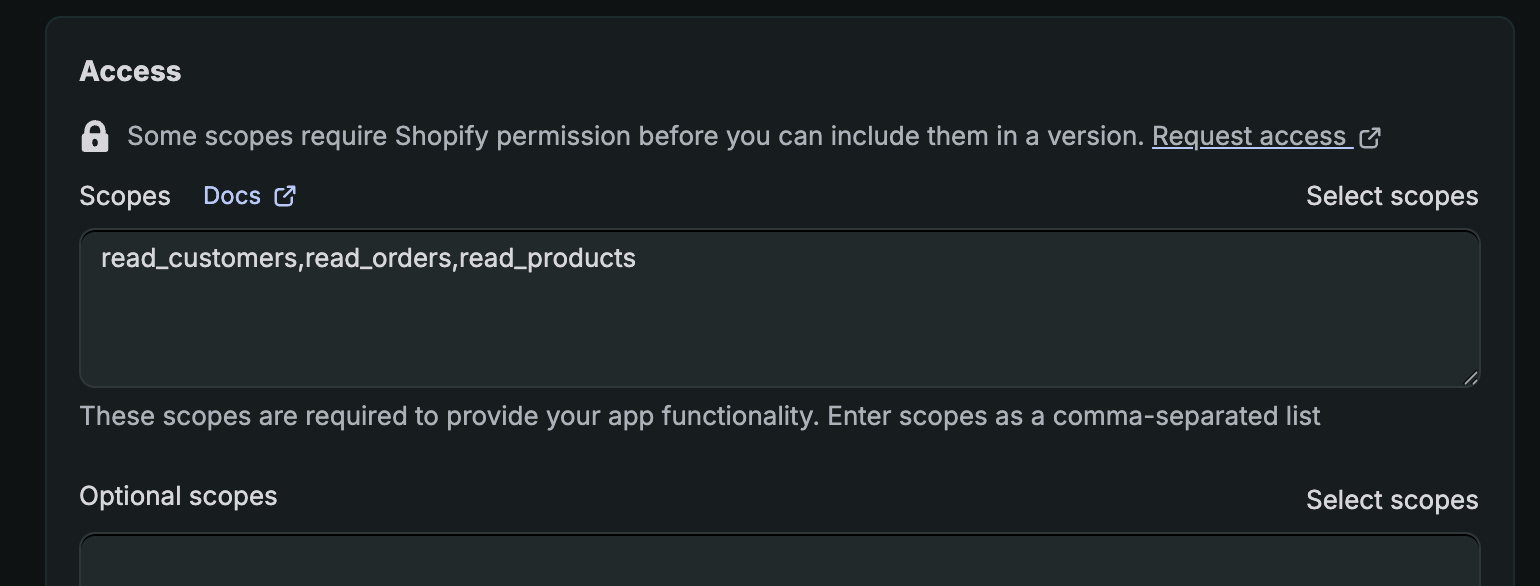 Now you need to enable permissions. Head back to the Shopify Dev Dashboard and scroll down to the Access section, and click “Select scopes”