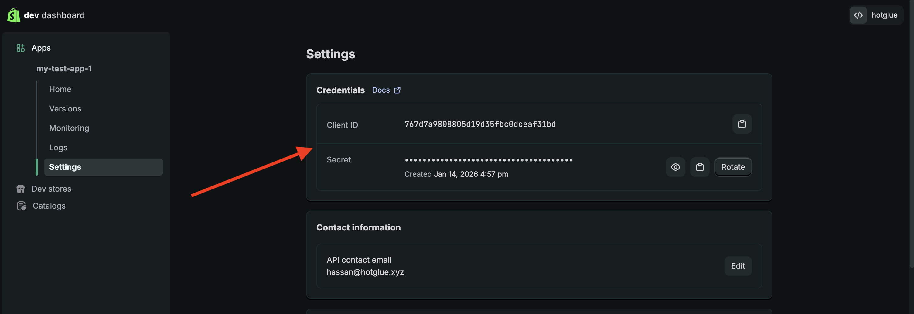 Now that the app is installed on the store, you can use the Client Id and Client Secret pair in Hotglue! To view the Client Id and Client Secret of our new app click on Settings in the left side nav.