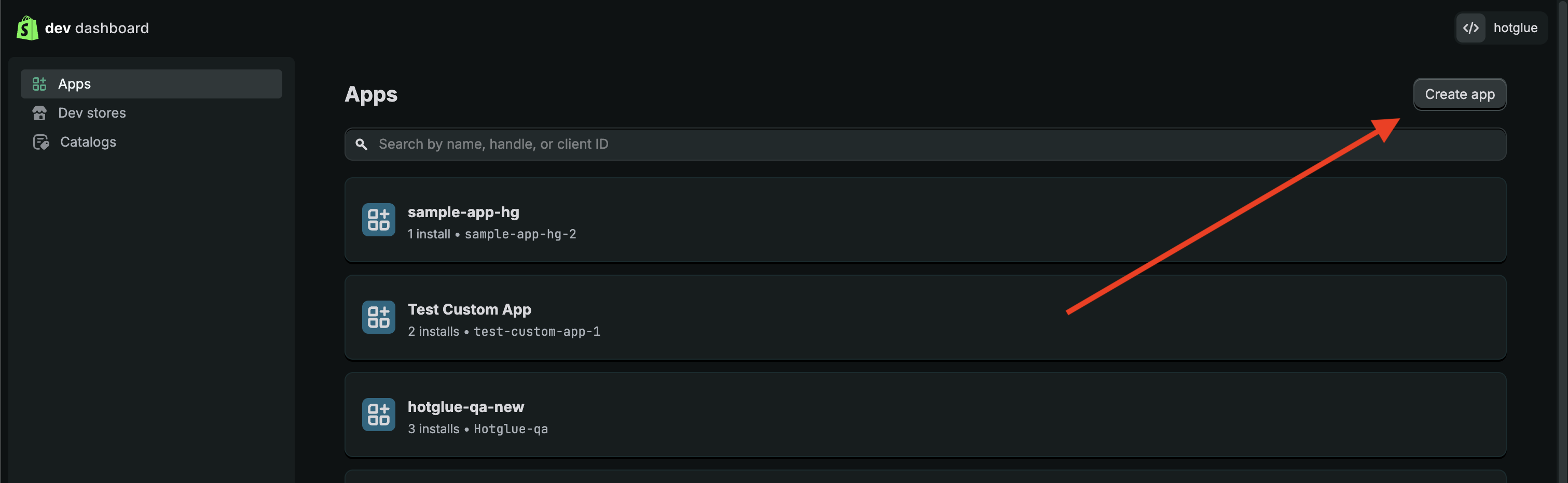 To start, you will need to create a Shopify developer account at shopify.dev. After entering some basic information, you’ll be taken to an overview page. There’s a tab that says “Build apps for clients or the Shopify App Store.” When you click it, you’ll see a button to create an app. Click that too. Once you name your app, you’ll get the Client ID and Client Secret that you need for hotglue. Add a logo and preferences URL while you’re at it.