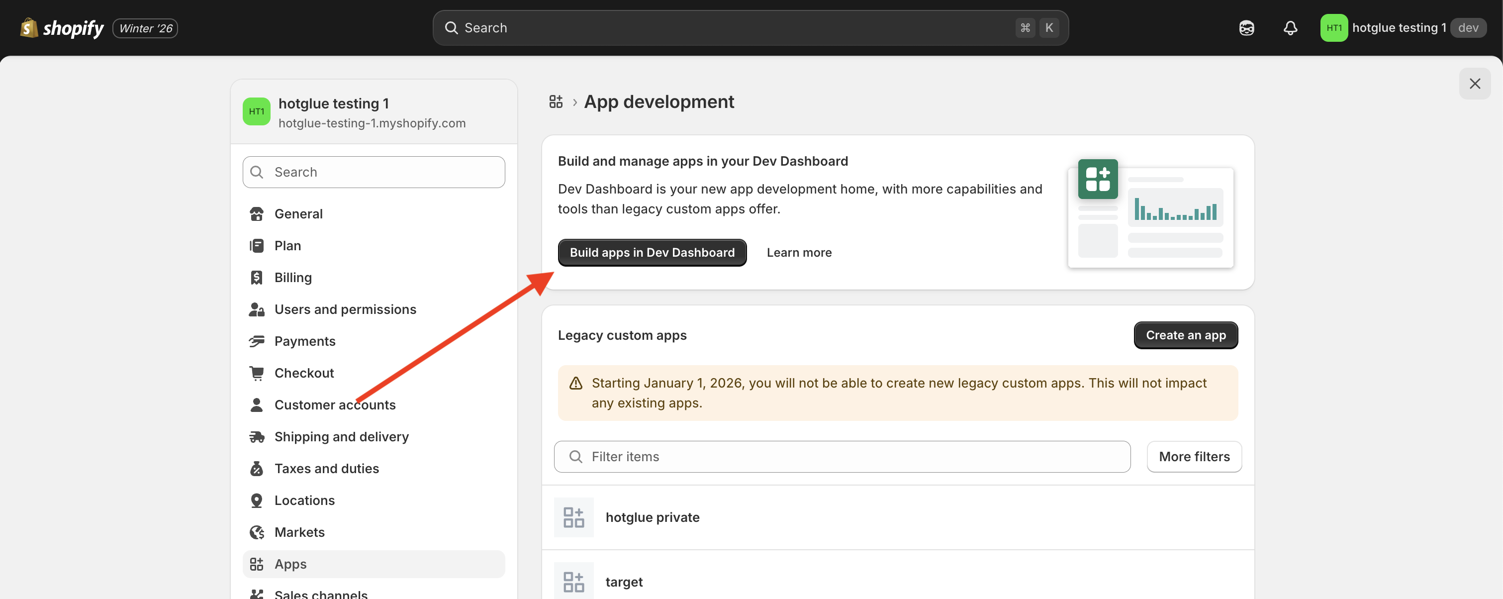 The first thing you need to do is log in to Shopify. If you’re just testing you can create a free partner account. Once logged in, on the left side of the screen, select the Apps option in the navigation bar. From there, select “Build apps in Dev Dashboard”