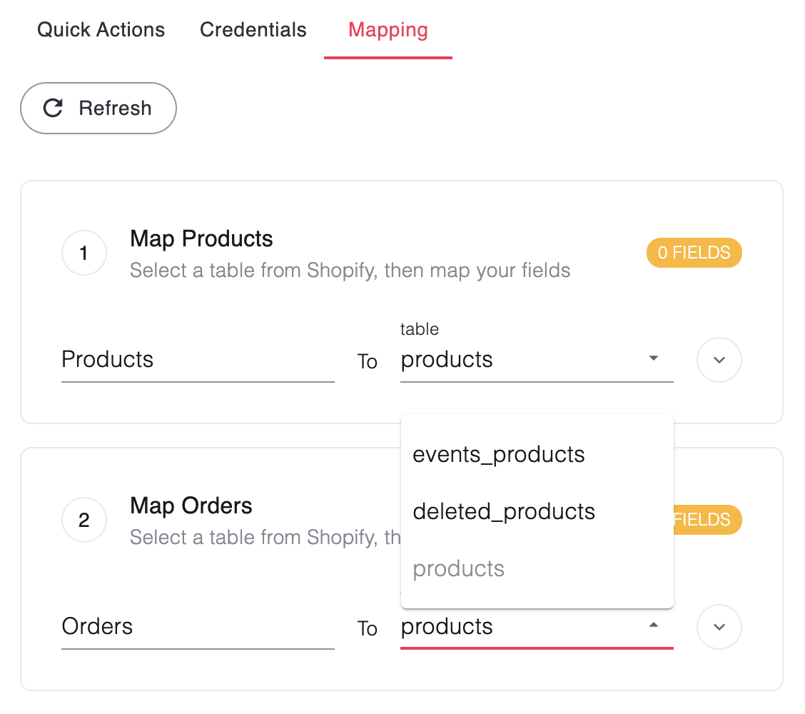 Custom field mapping allows your users to map fields in their connected system to your data model. Your users will see your app’s schema on the left, and available fields in their source system on the right.